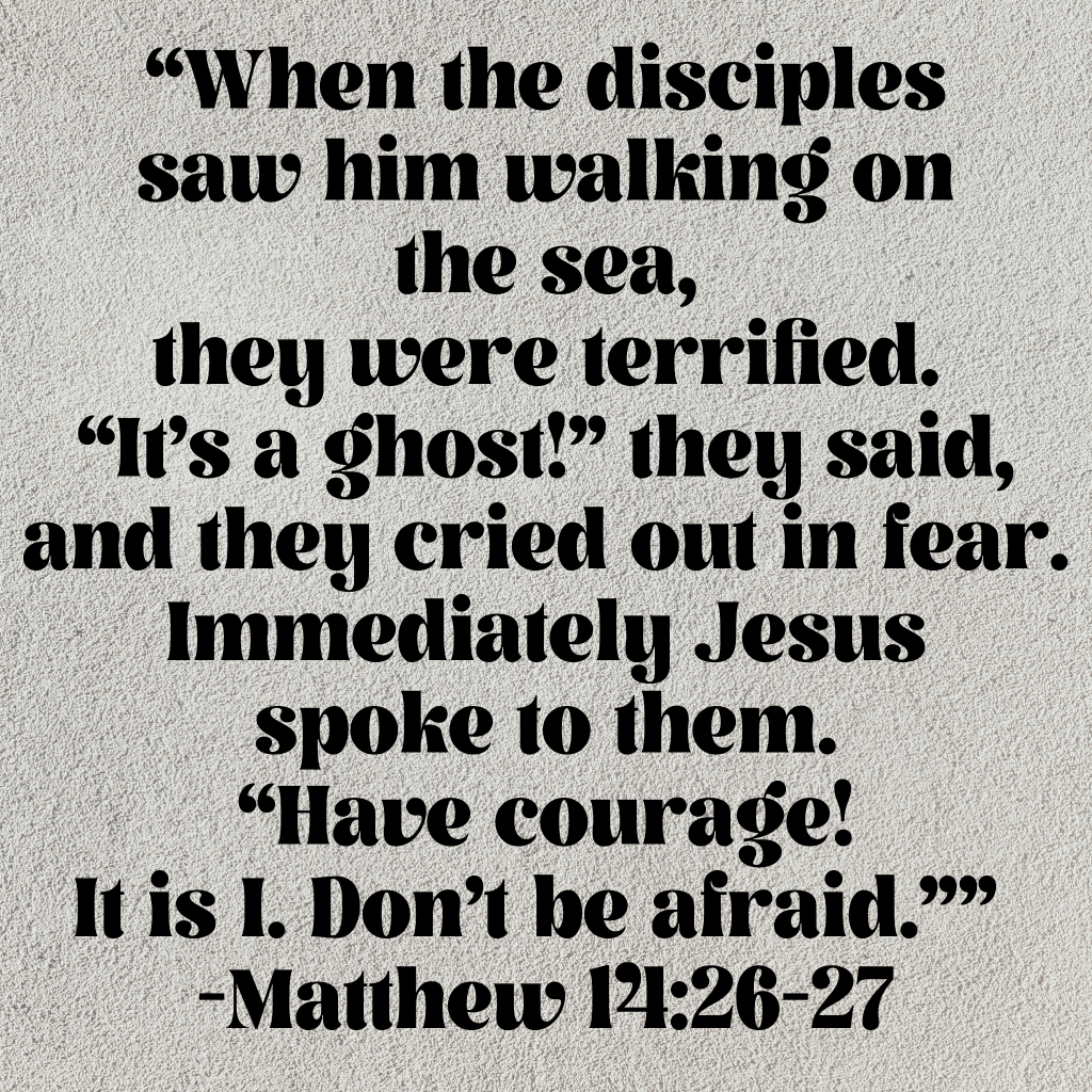 The next time you are afraid, call on Jesus. He will hear you and He will come to where you are. His words to us in those moments are, “Have courage! It is I. Don’t be afraid.”