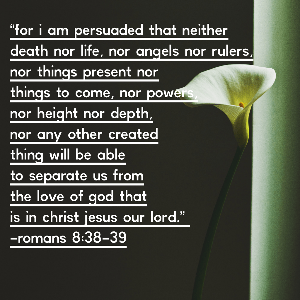 God loves you and He will never let you go. At times in our lives, our circumstances will be difficult and it can feel like God is far away. He is always near and He will never leave you.